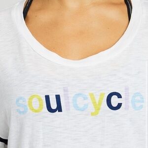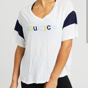 This Soulcycle X Sundry top is a perfect combination of comfort and workout. It is lightweight and breathable, offering a great workout top but it's also 100% cotton and extremely comfortable. It has has a retro feel, offering varsity sleeves and a color block spellout along the front.