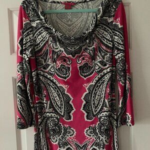 SUNNY LEIGH PAISLEY DRESS, Sz L, POLYESTER/SPANDEX. PREOWNED, GOOD CONDITION, BLACK/HOT PINK/WHITE.