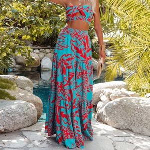 SUNNY OUTSIDE PRINTED TIERED MAXI SKIRT - TEAL RED