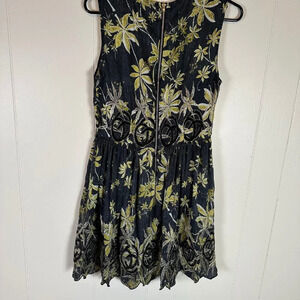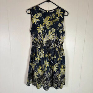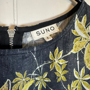 SUNO Sz 4 Silk Floral Fit & Flare Dress 100% Silk Blue Yellow Gold Embroidery