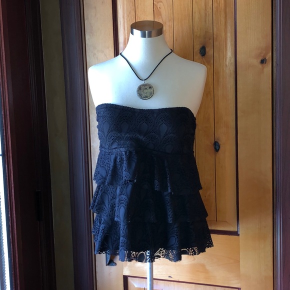 FINAL PRICING— 🖤 VERY CUTE Strapless Suntop... Padded Top. Three tier Lace scalloping down front and back. Looks better on than body form is showing. >>> Necklace for} Display Only. NFS.