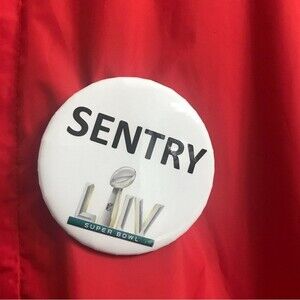 Red and white security staff jacket worn at Super Bowl 54 on Feb 2, 2019 for the game between the KC Chiefs and the SF 49ers in Miami. 100% polyester hooded windbreaker with full front zippered closure and zip up pockets. Includes Super Bowl pin.
