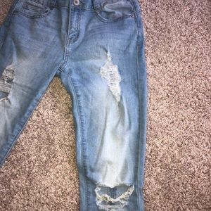 SUPER CUTE, ONLY WORN ONCE!!! Light wash, high waisted, distressed skinny jeans. Super comfortable with three bottoms at the top to assure placement of pants. Stretchy and comfortable