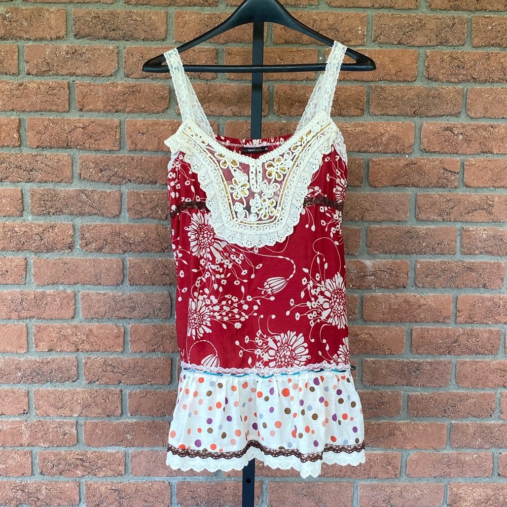 Bought this at a boutique in a college town. So cute and fun with so many details, including gold sequins under embroidered neck detail and polka dot ruffle bottom. Sleeves are elastic.