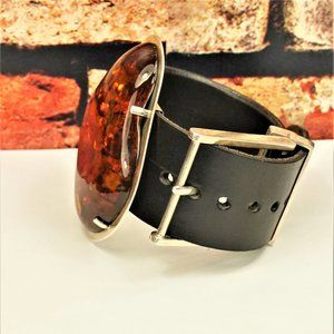 SUPER HUGE AMBER STERLING LEATHER RARE BRACELET 9 BY AMBERMODA UNISEX