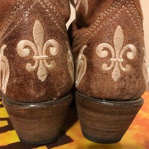 Tan (honey) distressed leather foot & upper with fleur de lis & scroll ivory embroidery on foot, shaft & heel.