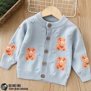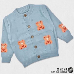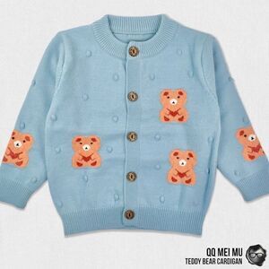 Baby Bear Knit Cardigan Sweater Teddy Bear Button Up Crewneck In Light Blue Unisex Toddler & Small Kid’s Sizes