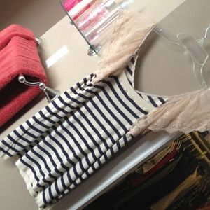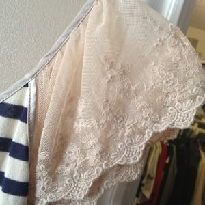 Sailor inspired. Cream with navy stripes. Elegant, creamy pink lace sleeves which fly away in the back. Worn a handful of times. Small rip as shown in pic, Was purchased that way. It was from the sensor tag. :(
