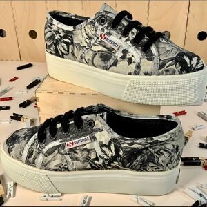 SUPERGA 2790 ANNABELLA FLORAL PLATFORM SNEAKER IN BLACK WHITE WOMEN’S SIZE EU 36