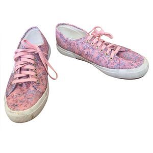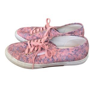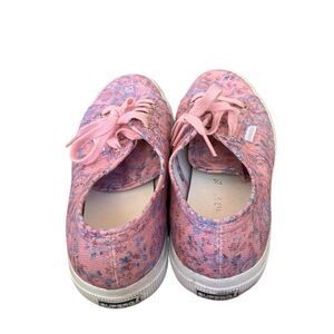Superga and LoveShackFancy have collaborated on a whimsical, vintage-inspired collection of shoes. These classic low-top sneakers feature a soft, pink and purple flower print with pink laces and gold-tone eyelets.