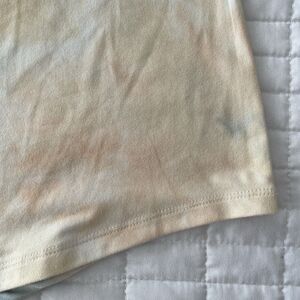 Peach / white / blue tie-dye, short sleeve, one-pocket, t shirt for workouts. Small pocket on chest. V neck. Swoop, rounded hem for figure-flattering look.