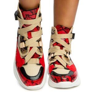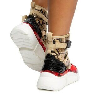FINISH OFF YOUR FIT WITH THE SUPERSTAR HIGH TOP SNEAKERS! THE DIFFERENT COLOR SNAKESKIN PRINTS MAKE THE SHOE COME TOGETHER ALL WHILE THE CLIP STRAP CLOSURES ADD THE FINISHING TOUCH.