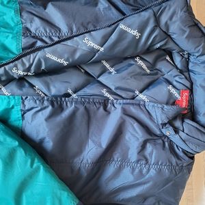 Genuine brand new, Never used SUPREME sideline parka navy blue and aqua. 100% Nylon Shell, 100% polyester lining. Detachable hood. Perfect condition. Has been packed up for several years.