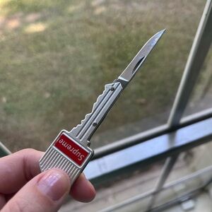 The Supreme Key Knife Silver is a stylish and functional accessory that doubles as a keychain. Made from durable metal, this keychain features a sleek silver design that is versatile and perfect for both men and women. The bold red color adds a pop of personality to any outfit, making it a standout piece in your accessory collection. With the trusted Supreme brand behind it, this keychain is not only fashionable but also a reliable tool for keeping your keys organized and easily accessible