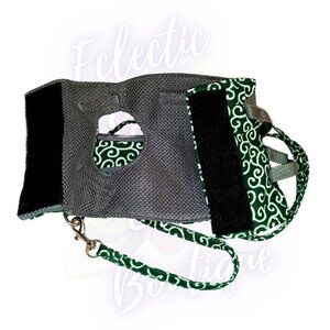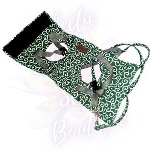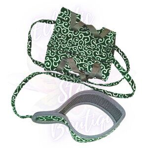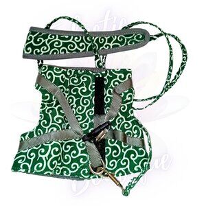 EUC ~ Never had a chance to use before puppy outgrew. However no longer have tags or original wrapper. SUREPET small dog or cat leash. It is green with white scroll. Comes complete with a matching leash. The closure snap is plastic and is adorned with a double d ring for the hook on the leash. The fabric is durable for long lasting wear and design for style as well as comfort! The harness will fit approx. 12-13" chest.
