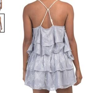Criss cross back, tiered ruffle design, metallic accents, braided straps
