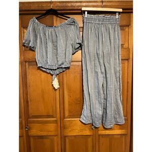 SURF GYPSY Women's Off-The-Shoulder Tassel Top Wide Leg Pant Blue Metallic SZ M