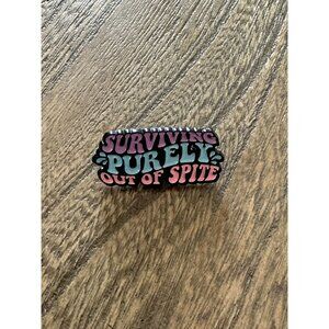 Showcase your rebellious spirit with this "SURVIVING OUT OF SPITE" enamel lapel pin. Perfect for jackets, backpacks, and hats, this pin is a great accessory for anyone with a sense of humor and determination.