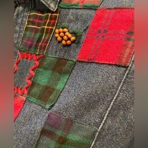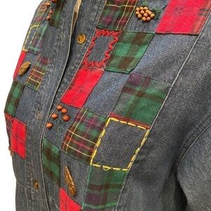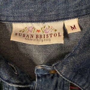 Vintage SUSAN BRISTOL Fall Denim Shirt Women's Long Sleeve Tartan Patched Chambray Size Medium 100% Cotton Has wooden beads and leaf accents. Fun top. Preowned in great condition. Perfect for the Fall. See all pics.