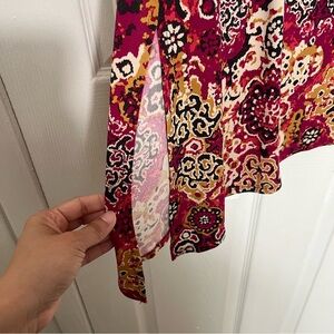 In good preloved condition. No rips or tears. Fuchsia colored with medallion print. Has slit on right side toward the bottom. Stretchy material. 3/4 sleeve. 95% polyester, 5% spandex.