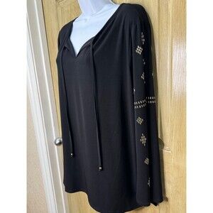 Elevate your wardrobe with this stunning Susan Graver blouse, perfect for any occasion. The black tunic shirt features a v neckline, long sleeves with studded accents. The blouse is made of a comfortable and stretchy polyester and spandex blend, ensuring a perfect fit for any body type. The studded accents add a touch of elegance to this versatile blouse, making it suitable for travel, party, casual, workwear, and business settings. Available in size L, this blouse is a must-have for any fashion-conscious woman.