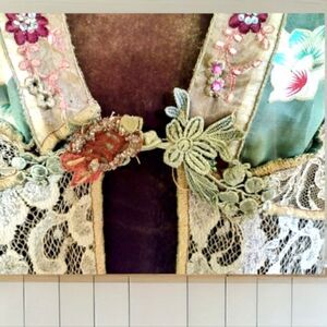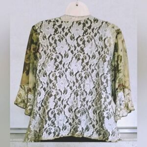 SUSAN GRAVER ESSENTIALS PLUSH VELVET Women's & a VINTAGE silky/Chiffon/Lace Jacket Susan Graver Stretch Knit Velvet Velour Tank Top   Loose, relaxed, fit.  Scooped neckline.  Straight hip-length hem Both are in EXCELLENT Gently PRE-OWNED CONDITION, ready to wear.  The JACKET/BLOUSE is so BEAUTIFUL! With a beautiful combination of a SILKY FLORAL patterned fabric, Chiffon A FULLY LACED BACK in a suttle GREEN LACE SLEEVES in Chiffon pattern & FLUTTER SLEEVES in Lace A DECORATIVE FROG CLOSURE Hues of Cream/Maroon/Soft Greens & some PALE BLUE too It is in GREAT CONDITION! Both pieces are SMALL LIKE NEW  Deep OLIVE GREEN Color Sleeveless Scoop Neck  QVC A21055 Perfect Wardrobe Staple to Layer under Blazers & Cardigans too! Great Pre- Owned Condition! Fabric: 92% Polyester 8% Spandex Machine wash and tumble dry Thank you and Happy Shopping! Pre-owned