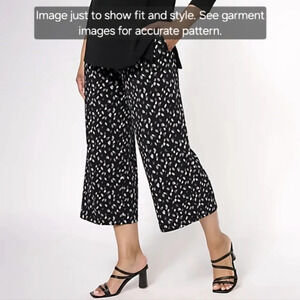 Black with white polka dot liquid knit culotte Capri Pants from Suan Graver. Extremely soft and cool to the touch. Wide pant leg makes these extra stylish for any occasion. Perfect for summer outings. Dress up or down. Great preloved condition.