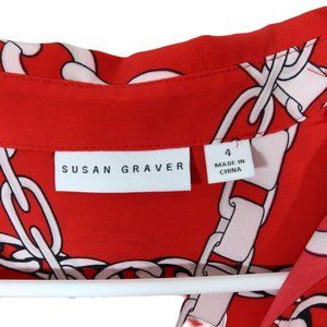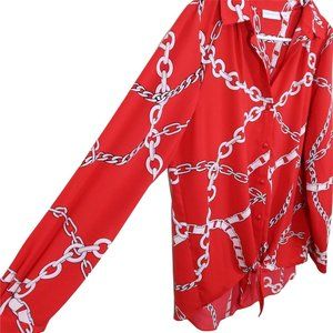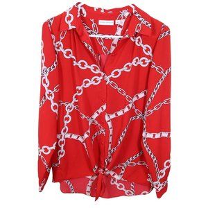 SUSAN GRAVER Size 4 Red White Chain Print Tie Front Button Up Blouse Shirt Top