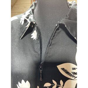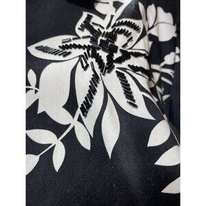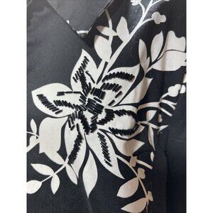 This is a Susan Graver women's blazer in size 1XL, featuring a floral black and white pattern with glass embroidery accents. The blazer has long sleeves, a zip closure, and is lined with shoulder pads. It is suitable for travel, casual, or business occasions in all seasons. The outer shell material is a cotton blend, and the blazer includes side pockets.