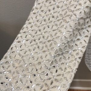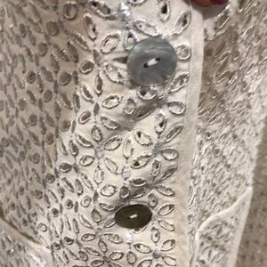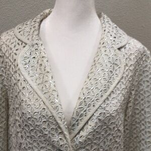 Susan Graver Style linen blend blazer. Eyelet floral cutouts. Ivory color with silver tone metallic thread trim. Two front patch pockets. Three mother of Pearl button front closure. The bottom button is missing but there is an extra button sewn into the inside seam. I am sure it is a simple fix, but you do not want me to try to do it. Very good pre-owned condition. Perfect for Spring and summer. Size M