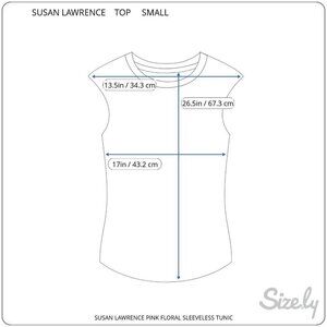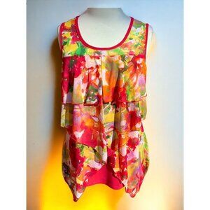 Chic Susan Lawrence sleeveless tunic in beautiful pink floral design. Features a unique handkerchief front and flattering scoop neck. Preowned, but in excellent/pristine condition. Perfect for stylish ladies looking to make a statement.
