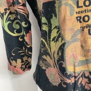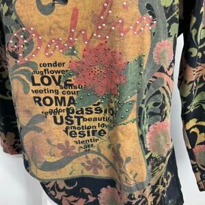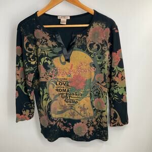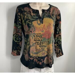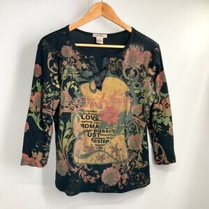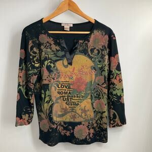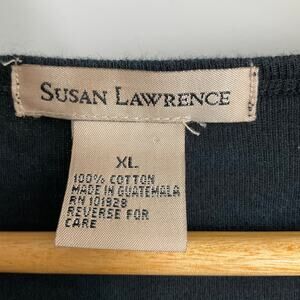 The Susan Lawrence Vintage Y2k Grunge Goth Black Bling Witchy 3/4 Sleeve XL T-shirt is a unique and edgy top perfect for fans of alternative fashion. Made of 100% cotton with a knit fabric type, this pullover shirt features a round neckline, floral pattern, and a colorful, eclectic theme inspired by hipster, art, y2k, grunge, bohemian, and gothic styles. The vintage brand and retro design give it a 90s, witchy, fairy vibe with steampunk and bling accents, making it a standout piece for women looking to express their individuality and creativity through their clothing choices.