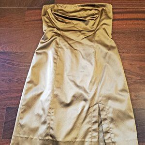 Authentic vintage Susan Lazar strapless dress in beautiful copper fabric with front slit and lined throughout. This ultra-glam dress has an old Hollywood feel with a modern twist with this knee-length cut. A show-stopper at any party.