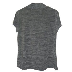 New Without Tags - This shirt has never been worn but tags were removed. This shirt is a polyester and spandex blend that is soft to the touch. It has a metallic embellishment that is sewn into the garment. The black piece in the center of the shirt is attached to the main gray piece of the garment.