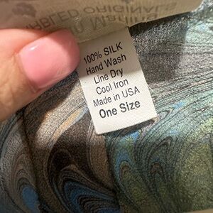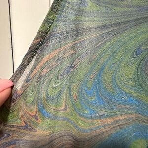 Elegant scarf like vest with a swirl pattern. Features blue, green, and brown hues. Perfect for adding a pop of color to any outfit.