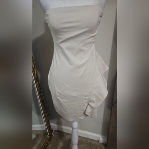 Stylish cream strapless dress with a chic ruffle detail. Perfect for any occasion.