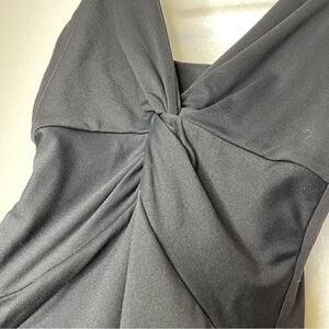 •Features: Black bodysuit with twist front detail. Snap closure. Thong bottom.