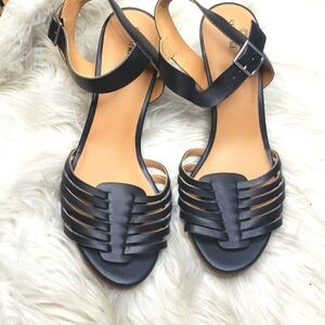 A gladiator-inspired caged vamp offers a stylishly chic flair into an ankle strapped sandal balanced upon a stacked wedge heel.