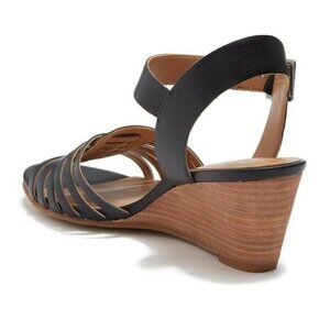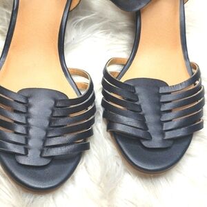 A gladiator-inspired caged vamp offers a stylishly chic flair into an ankle strapped sandal balanced upon a stacked wedge heel.