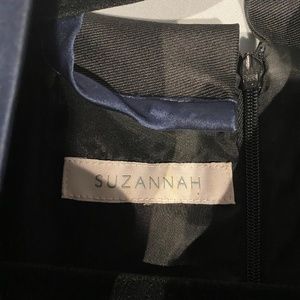 This GORGEOUS Suzannah London dress is a must-have for any fashion-forward woman. With its stunning kaleidoscope design in classic black with blue trim around neckline, this dress is perfect for any party or special occasion. The boat neck and 3/4 length sleeves add a touch of elegance, while the fit & flare style and knee-length hemline create a flattering silhouette. Crafted from a luxurious blend of polyester and silk, this dress is dry clean only and has a zip closure. The dress is a size XS and is perfect for those who love a 50s-inspired look with a touch of London glamour. This dress is perfect for any season, whether it be winter, autumn, or spring. Don't miss out on the chance to own a piece of royal fashion history, as it has been worn by royalty. See photos for condition and details.