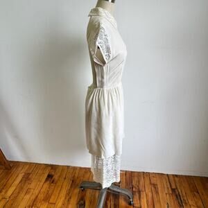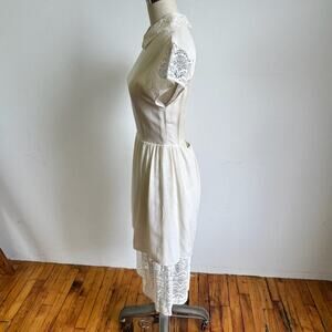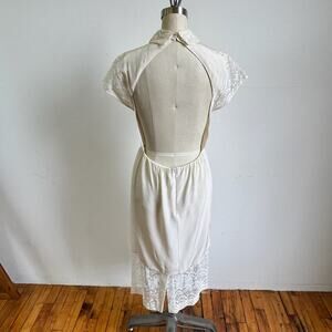 Details: Ivory Silk and lace midi dress with high neck and lace collar, lace short sleeves, cut out open back - a little skin to balance an otherwise modest garment. The skirt has two layers: a shorter silk layer to the knee, and a midi-length lace layer. Elastic waist is fitted with back zipper closure on the skirt and hook and eye closure at the neck. This dress would be a great for days out, or for bridal and wedding-related events!