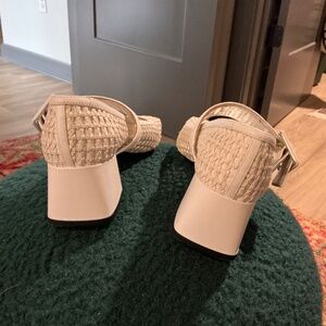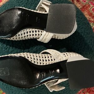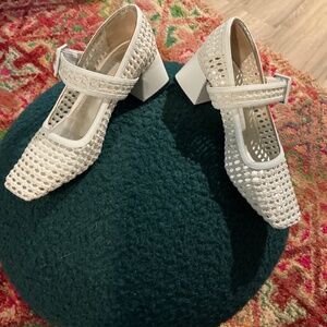 Worn once and in excellent condition. Closed Maryjane in open weave Nappa leather with solid leather trim and wrapped heel. Leather wrapped buckle. Square toe and covered angular block heel.