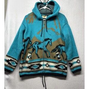 SW Aztec Hoodie VTG Zip Up Wool Blend Hooded Jacket Size Small 90s Teal Horse