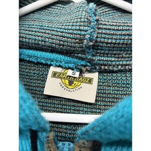 The SW Aztec Hoodie VTG Zip Up Wool Blend Hooded Jacket is a vintage men's outerwear piece from the 90s by Earth Ragz. This teal-colored jacket features a wool blend material, a hood, and a zip-up closure, perfect for casual occasions. With a hippy look and a size small, this original piece is sure to add a unique touch to any wardrobe. Made in Ecuador, this jacket showcases a blend of traditional and modern styles for a truly distinctive vintage appeal.