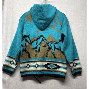 SW Aztec Hoodie VTG Zip Up Wool Blend Hooded Jacket Size Small 90s Teal Horse