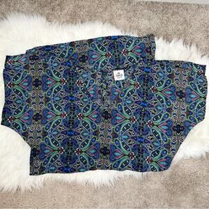 Gorgeous sheer silk short dolman sleeved mini dress with bright colorful boho maximalist paisley all over print and drawstring at waist. V-neckline and keyhole button closure in the back. Could also be a beautiful bathing suit swim cover up! Totally beach vacation or cabana by the pool ready!