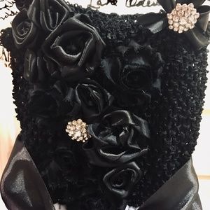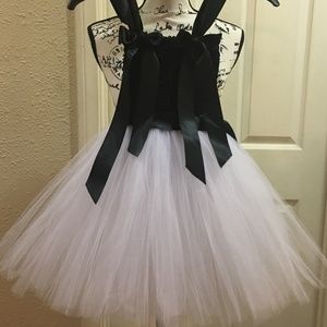 Nothing could be more sophisticated, elegant, and charming than Our "SWAN PRINCESS" black and white couture flower girl tutu dress. This gorgeous dress is full and elegant and comes with a black rhinestone embellished waistband. Features: Black double satin ribbon straps with long draping large satin bows in back and double sided satin waistband and bow. Antique rhinestone buttons on each shoulder and black rhinestone waistband. *Available in additional sizes at www.adinaballerina.com