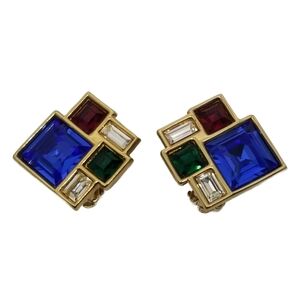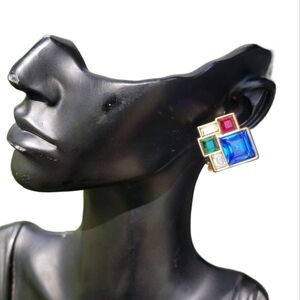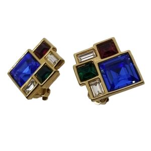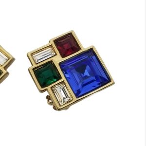 Rare vintage earrings by Swarovski circa.1980s-90s. Earrings are goldtoned and set with large square and rectangular Swarovski crystals of different sizes and colors. Earrings measure 1-1/8 inches tall and 1-1/4 inches wide. they have clip on style backs and the signature Swarovski swan stamp. Earrings are in excellent condition.