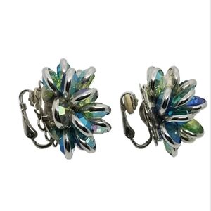 Beautiful vintage earrings from the Swarovski Savvy collection circa. 1980s-90s. Earrings are clip on style with silvertoned hardware and bezel set blue, green and aurora borealis color Swarovski crystals in a cluster style design. Earrings measure 1-1/8 inches tall and 3/4 inch wide. Excellent condition.