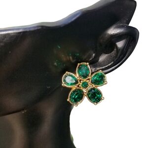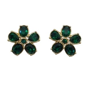 Beautiful emerald green Swarovski crystal and goldtone flower earrings by Swarovski Savvy collection. Earrings are circa. 1990s. Earrings measure approx. 7/8 inch tall ×7/8 inch wide, they have stud backs and are stamped with the trademark Swarovski Swan on back.